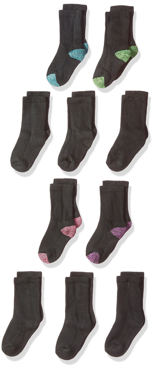 Fruit of the Loom Girls' Little Crew Socks (10 Pairs), Black/Pink/Green/Blue/Purple, Small (Shoe Size: 6-10.5)