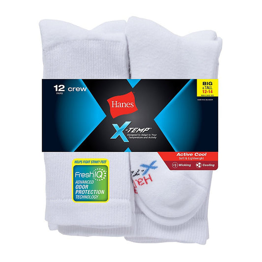 HANES Men's FreshIQ X-temp Crew 12-pack Socks, White, 12-14