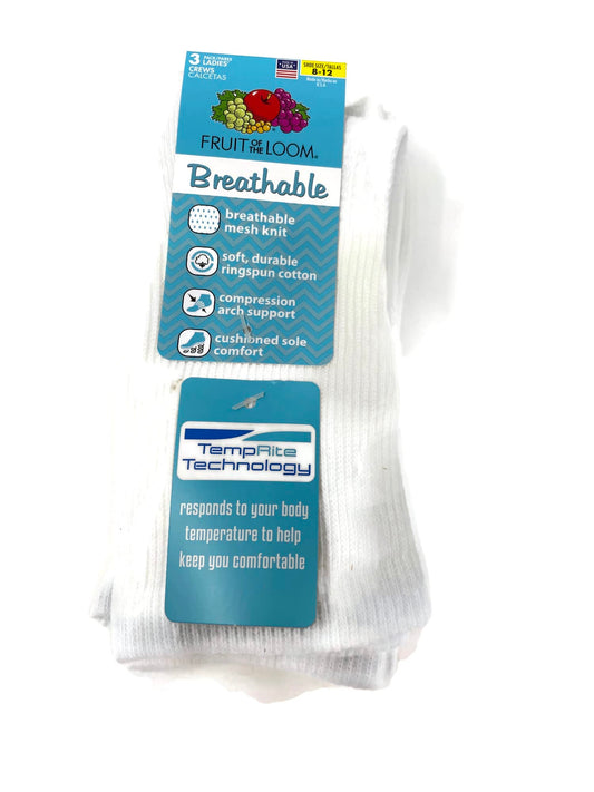 Fruit of the Loom Womens Breathable 3 Pack Crew Socks, White, 4-10