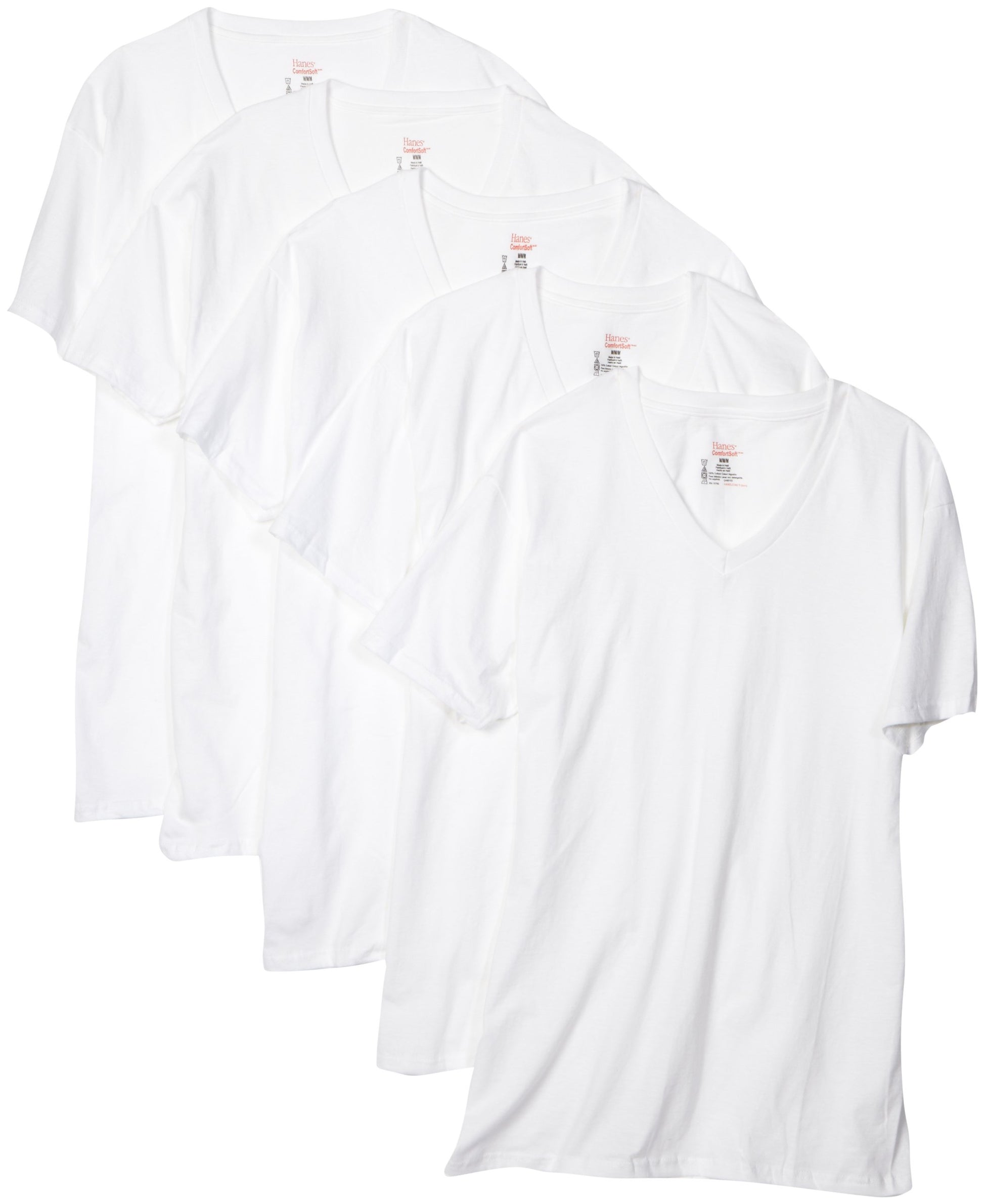 Your day goes better when you're comfortable. So, before all else, pull on this Hanes Men's TAGLESS tee. Soft ComfortSoft cotton knit fabric ...preshrunk for lasting fit.TAGLESS undershirt for a comfortable, no-itch neckline.Ribbed, two-ply V-neck keeps its shape for the long haul.Full cut for added ease.Roomy armholes allow freedom of movement. Generous length stays neatly tucked.Available in a convenient 7-pack.